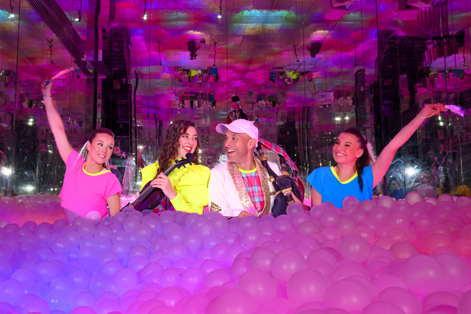 The Tattoo Performers taking on the Electro Pipes set have been wowing crowds this month with their high energy, neon lit performance but swapped the Castle Esplanade for the bright disco lights and mesmerizing mirrors at Ballie Ballerson as they plunged waist-deep into its famous ball pit.